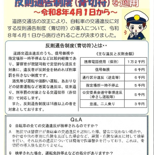 最近、新聞等に掲載されておりますがみなさまご存じでしょうか? 道路交通法改正により、自転車の交通違...