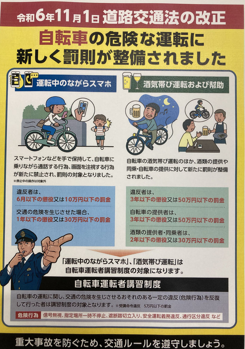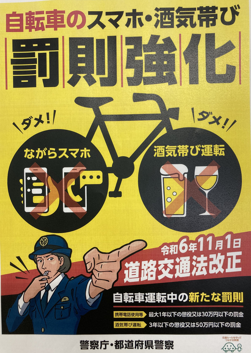 2024年11月 自転車の「ながらスマホ」が罰則強化!「酒気帯び運転」は新たに罰則対象に! 2024年11月から、自転車運転中にスマホで通話(ハンズフリー装置を併用する場合等を除く)したり、画面を注視したりする「ながらスマホ」が道路交通法により禁止され、罰則が強化されました。スマホを手に持って画面を注視することはもちろん、自転車に取り付けたスマホの画面を注視することも禁止されます。 自転車の酒気帯び運転のほか、酒類の提供や同乗・自転車の提供に対して新たに罰則が整備されました。 改めて自転車を運転する際のルールを確認し、安全な利用をお願いします。
