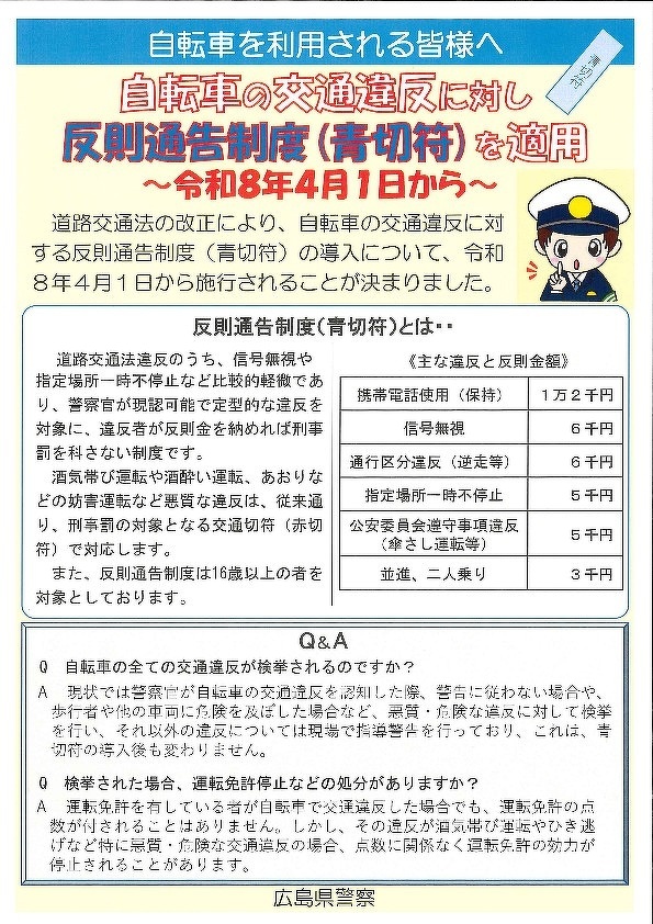 道路交通法改正により、自転車の交通違反に対する反則通告制度(青切符)の導入について、令和8年4月1日から施行されることが決まりました。広島県警のホームページ等にも記載があります。