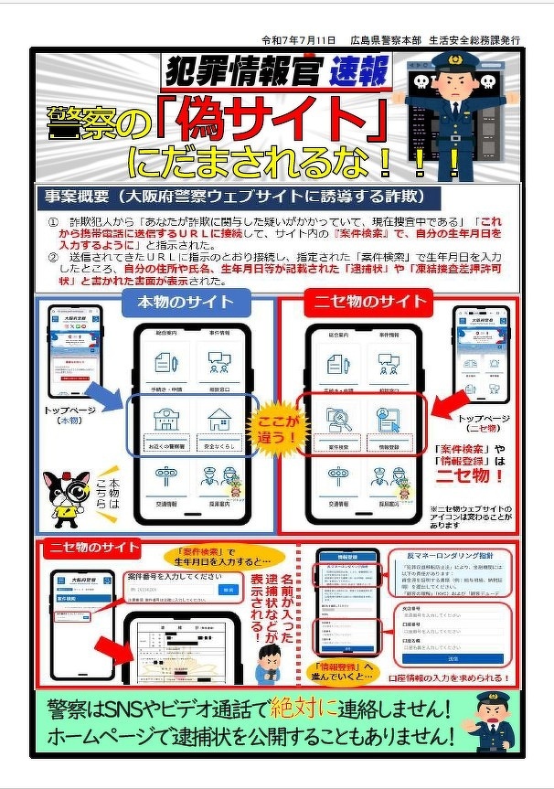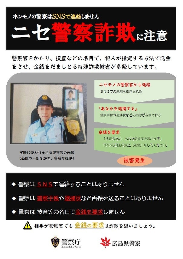 その際に、警察からは携帯から連絡することはありません。知らない携帯番号、特に日本国外からの着信には出ないようにとおっしゃられてました。
